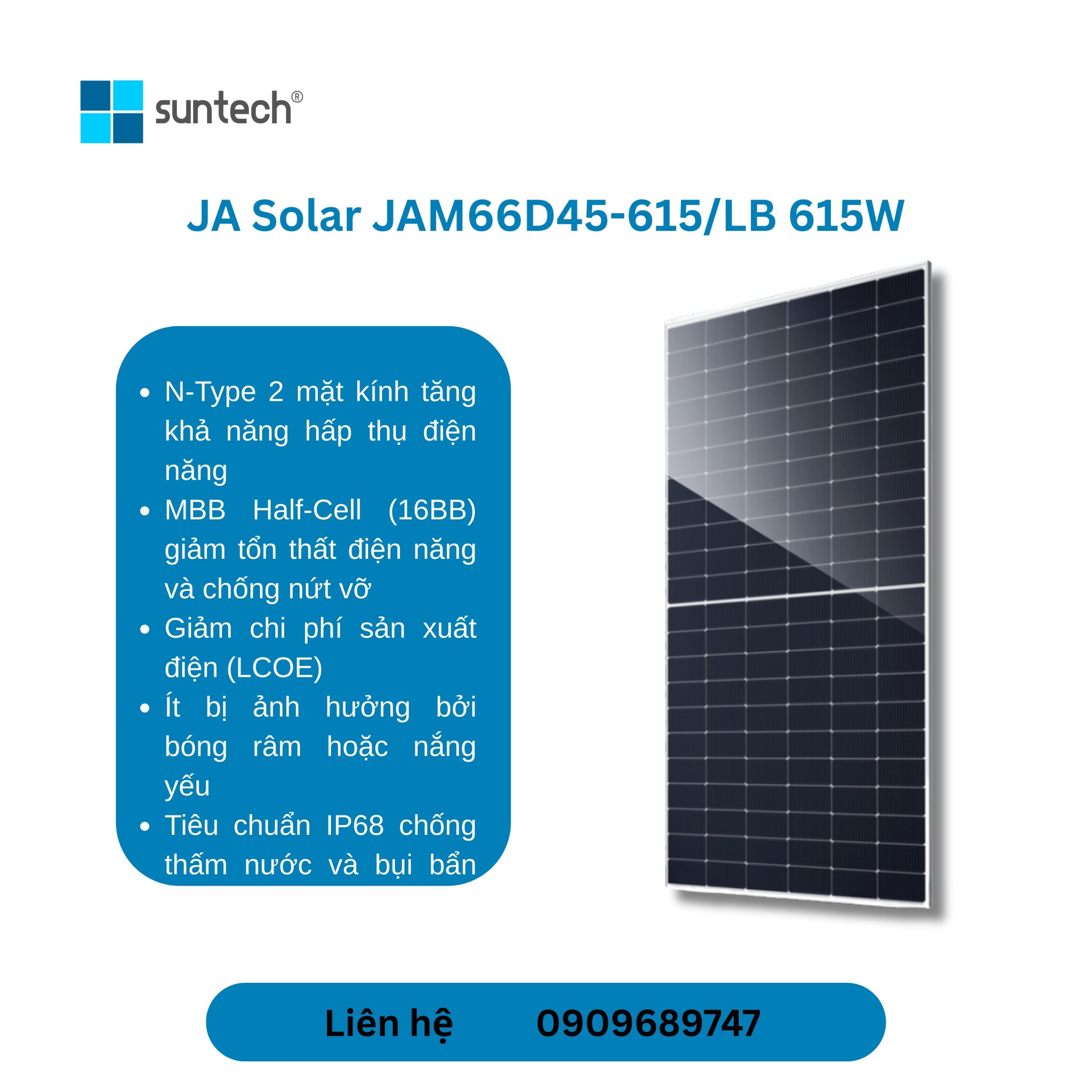 Nhờ hiệu suất vượt trội và độ bền cao, JA Solar 615W đặc biệt phù hợp với các dự án muốn tối ưu chi phí đầu tư trên mỗi kWp.
